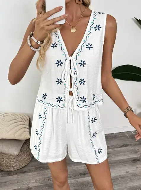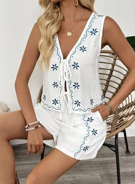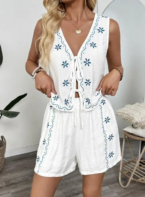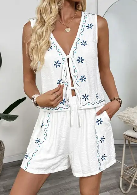 2025 verão conjunto de duas peças roupa feminina nova impressão bordada com decote em v sem mangas rendas até topo e bolso casual conjunto de shorts diários